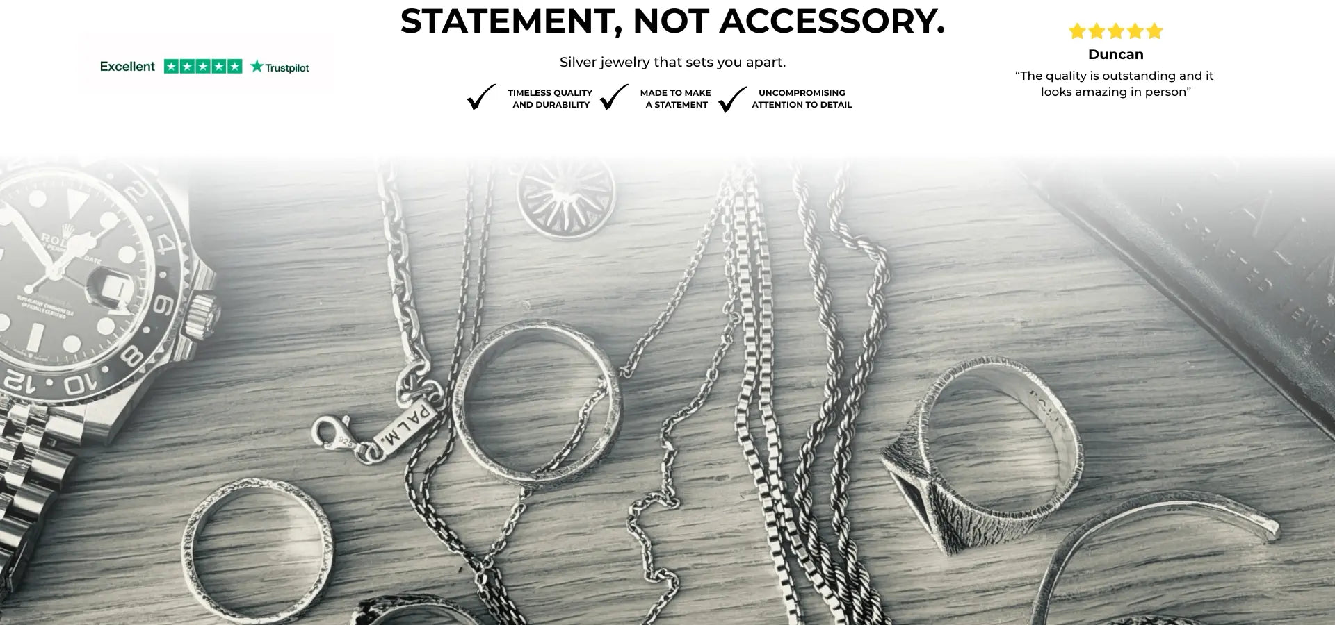 PALM. Jewelry is gemaakt voor mannen die niet volgen, maar creëren. Elk stuk is met de hand ontworpen om kracht, karakter en stilte uit te dragen. Geen trends. Geen ruis. Alleen puur zilver dat spreekt zonder woorden. Ontdek sieraden die meer zijn dan accessoires, symbolen van identiteit. Welkom bij PALM., waar elke ring, armband en ketting zijn eigen verhaal draagt.